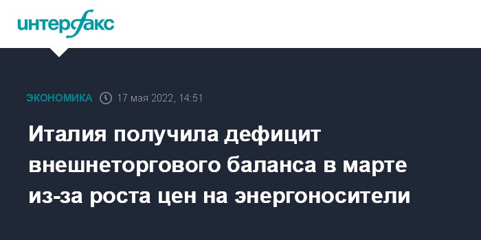 Москва. 17 мая. INTERFAX.RU - В марте 2022 года дефицит внешнеторгового баланса Италии составил 84 млн евро по сравнению с профицитом в 5,19 млрд евро в марте 2021 года, сообщил Национальный институт статистики (Istat).