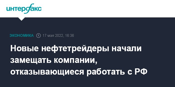 Москва. 17 мая. INTERFAX.RU - Крупнейшие мировые нефтетрейдеры сворачивают отношения с Россией, и их замещают как ранее уже работавшие с РФ компании, так и совершенно новые.