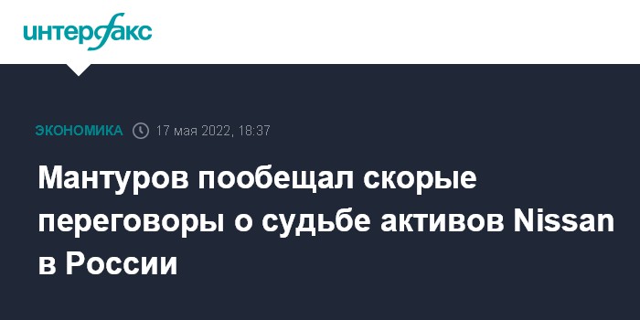 Москва. 17 мая. INTERFAX.RU - Переговоры о дальнейшей судьбе активов иностранных автоконцернов, приостановивших производство в РФ на длительный срок, продолжатся в ближайшее время. Одним из первых на очереди будет Nissan, сообщил глава Минпромторга РФ Денис Мантуров журналистам.