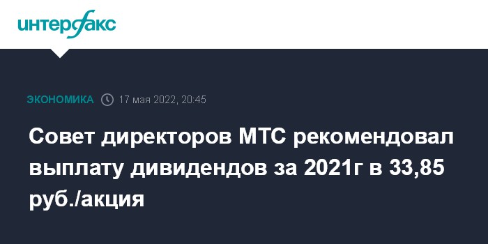 Совет директоров МТС рекомендовал выплату дивидендов за 2021г в 33,85 руб./акция