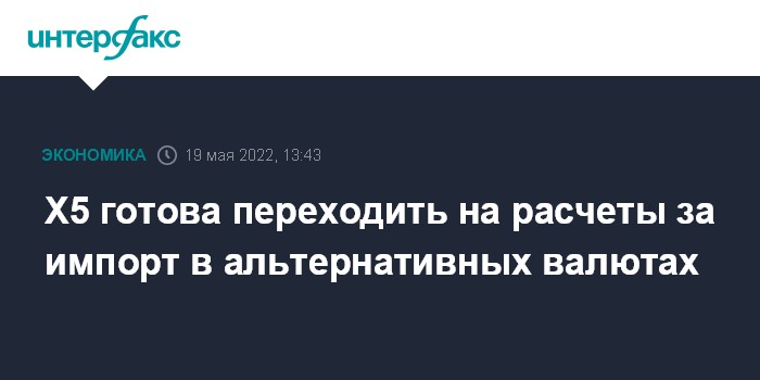 Москва. 19 мая. INTERFAX.RU - X5 Group, крупнейший в РФ ритейлер, управляющий магазинами "Пятерочка", "Перекресток", "Чижик" и "Карусель", готова переходить с расчетов в долларах и евро при оплате за импорт на расчеты в национальных валютах, включая рубли, юани, турецкие лиры и т.д.