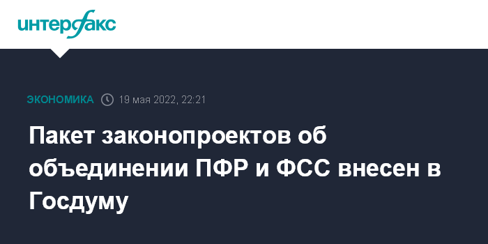 Москва. 19 мая. INTERFAX.RU - Правительство внесло в Госдуму пакет законопроектов, которые позволят объединить Пенсионный фонд (ПФР) и Фонд социального страхования (ФСС) в единый Фонд пенсионного и социального страхования РФ, прописывается введение с 2023 года единого тарифа страховых взносов.