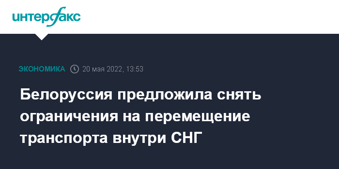 Москва. 20 мая. INTERFAX.RU - Белоруссия предлагает странам СНГ отменить ограничения на перемещение физлиц и всех видов транспорта внутри Содружества на фоне усиления западных санкций в отношении белорусских и российских грузоперевозчиков.