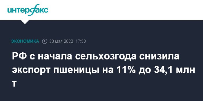 Москва. 23 мая. INTERFAX.RU - Россия с начала текущего сельхозгода (с 1 июля 2021 года) по 23 мая этого года экспортировала 34,15 млн тонн пшеницы, что на 11% меньше, чем за аналогичный период в прошлом сельхозгоду. Экспорт зерна в целом снизился на 20%, до 38,5 млн тонн, следует из мониторинга Российского зернового союза.
