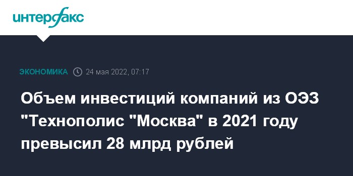 "Объем инвестиций резидентов ОЭЗ за 2021 год в 3,2 раза превышает результат предыдущего года, когда на создание и развитие высокотехнологичных производств столицы было направлено более 8,8 млрд рублей. Кроме того, по сравнению с 2019 годом, когда компании вложили в экономику города 6,5 млрд рублей, показатель увеличился в 4,3 раза", - приводятся на официальном сайте московской мэрии слова заммэра Москвы по вопросам экономической политики и имущественно-земельных отношений Владимира Ефимова.