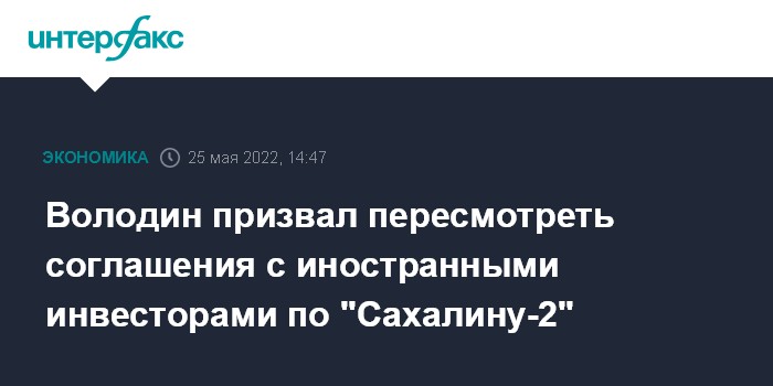 Москва. 25 мая. INTERFAX.RU - Спикер Госдумы Вячеслав Володин предложил пересмотреть соглашение о разделе продукции в рамках проекта "Сахалин-2", передать долю иностранных инвесторов в проекте от недружественных стран - государству или "Газпрому".