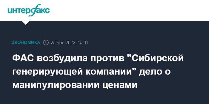 Москва. 25 мая. INTERFAX.RU - Федеральная антимонопольная служба (ФАС) возбудила дело в отношении ООО "Сибирская генерирующая компания" (СГК), компания подозревается в манипулировании ценами на оптовом рынке электроэнергии, сообщило ведомство.