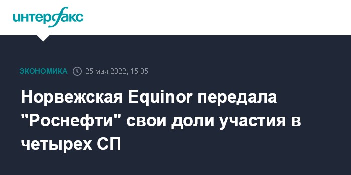 Москва. 25 мая. INTERFAX.RU - Норвежская Equinor передала "Роснефти" свои доли участия в четырех российских совместных предприятиях и освобождается от всех будущих обязательств, сообщила компания в среду.