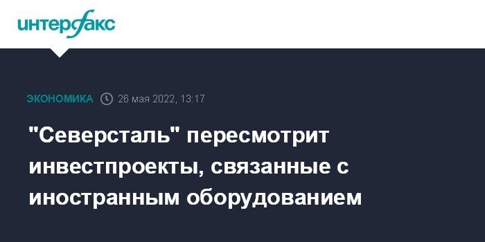 Москва. 26 мая. INTERFAX.RU - "Северсталь" пересмотрит инвестиционные проекты 2022 года, находящиеся на ранней стадии реализации и связанные с иностранным оборудованием, перенесет сроки по ним, заявил журналистам глава компании Александр Шевелев.