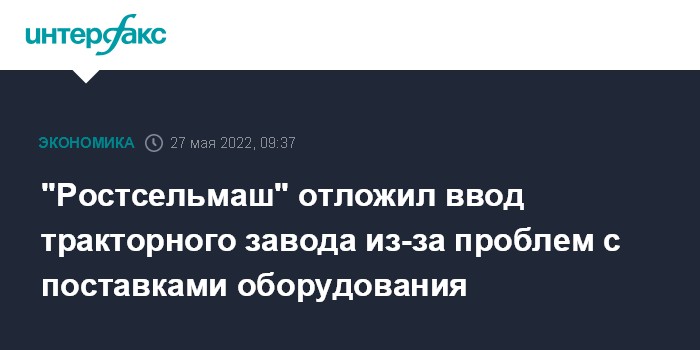 Москва. 27 мая. INTERFAX.RU - "Ростсельмаш" отложил на середину 2023 года ввод тракторного завода в Ростове-на-Дону, сообщил гендиректор предприятия Валерий Мальцев на заседании совета по инвестициям при губернаторе Ростовской области.