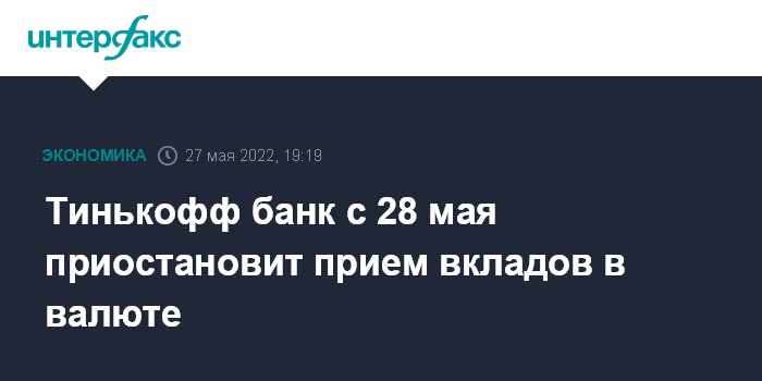 Москва. 27 мая. INTERFAX.RU - Тинькофф банк с 28 мая временно перестанет открывать вклады в валюте, говорится в сообщении кредитной организации в ее официальном телеграм-канале.