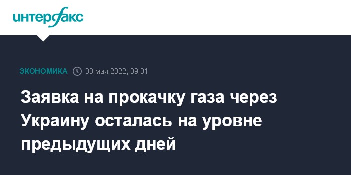 Москва. 30 мая. INTERFAX.RU - "Оператор ГТС Украины" принял от "Газпрома" заявку на транзит газа на понедельник в объеме 44,6 млн кубометров, свидетельствуют данные украинской компании. В воскресенье этот показатель был 44,1 млн кубометров. Мощности заявлены только по одной из двух точек входа в ГТС Украины - газоизмерительной станции "Суджа". По коридору через ГИС "Сохрановка" заявка не принята.