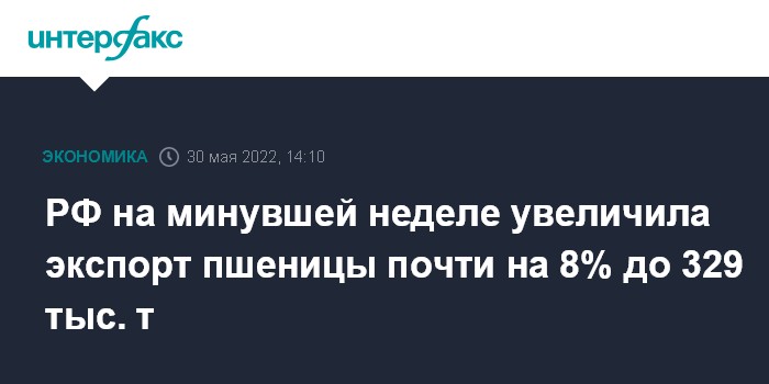 РФ на минувшей неделе увеличила экспорт пшеницы почти на 8% до 329 тыс. т