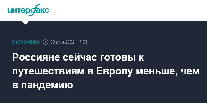 Москва. 30 мая. INTERFAX.RU - Из-за спецоперации на Украине и антироссийских санкций желание россиян поехать в Европу достигло самого низкого уровня за всю историю наблюдений - 78 пунктов из 100, показало исследование Европейской комиссии по путешествиям (ЕТС). В первую волну пандемии, в мае-августе 2020 года показатель составлял 87 пунктов.