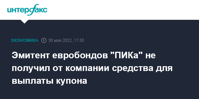 Москва. 30 мая. INTERFAX.RU - PIK Securities DAC, компания-эмитент долларовых еврооблигаций девелопера "ПИК" с погашением в 2026 году, не получила средства для выплаты купона по этому выпуску.