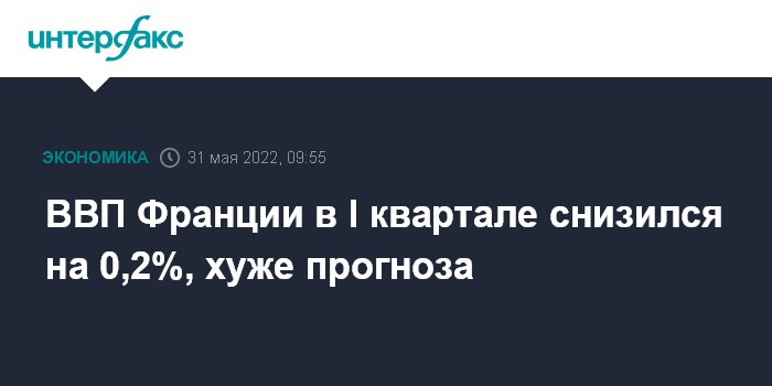 Москва. 31 мая. INTERFAX.RU -В первом квартале 2022 года ВВП Франции уменьшился на 0,2% по сравнению с предыдущими тремя месяцами, показали окончательные данные национального статистического института Insee.