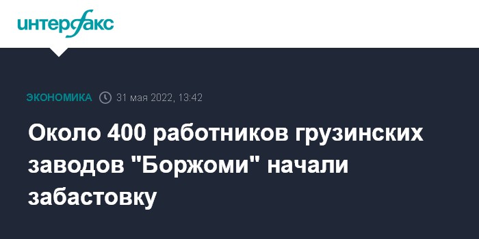 Москва. 31 мая. INTERFAX.RU - В Грузии больше 400 работников двух заводов по розливу минеральной воды "Боржоми" с утра 31 мая начали забастовку. Они требуют восстановить уволенных, сменить администрацию компании-собственника и улучшить им условия труда, передает первый канал грузинского телевидения.