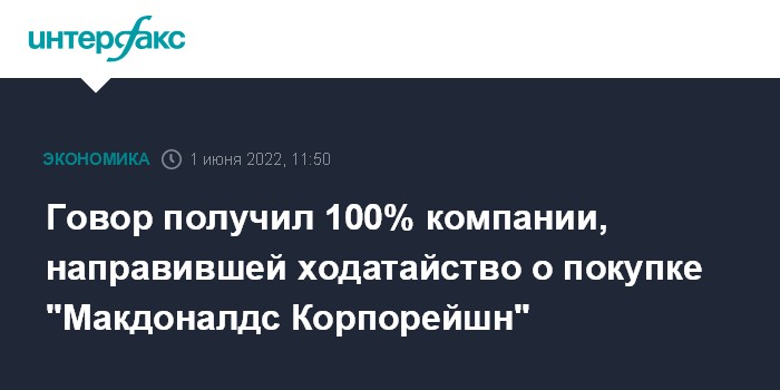 Говор получил 100% компании, направившей ходатайство о покупке "Макдоналдс Корпорейшн"