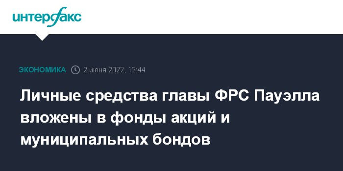 Москва. 2 июня. INTERFAX.RU - Личные средства председателя Федеральной резервной системы США Джерома Пауэлла инвестированы преимущественно в фонды акций и муниципальные облигации, пишет The Wall Street Journal со ссылкой на его декларацию о доходах за 2021 год.