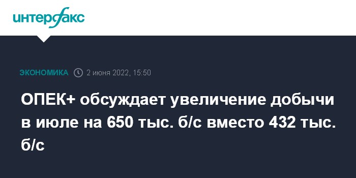 ОПЕК+ обсуждает увеличение добычи в июле на 650 тыс. б/с вместо 432 тыс. б/с