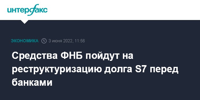 Москва. 3 июня. INTERFAX.RU - Средства, выделяемые правительством из Фонда национального благосостояния (ФНБ), пойдут на реструктуризацию долга S7 перед банками, сообщила "Интерфаксу" представитель компании.
