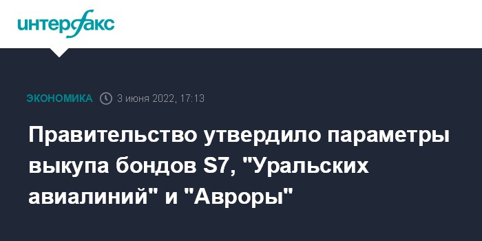 Москва. 3 июня. INTERFAX.RU - Правительство утвердило параметры выкупа за счет средств Фонда национального благосостояния (ФНБ) облигаций авиакомпаний S7, "Уральские авиалинии" и "Аврора", такое постановление опубликовано на портале правовой информации.