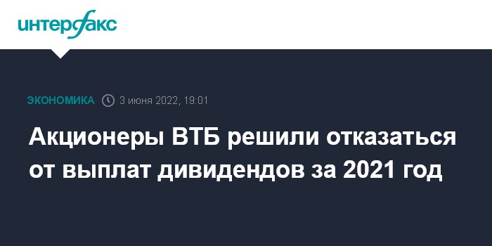Москва. 3 июня. INTERFAX.RU - Годовое собрание акционеров ВТБ приняло решение не выплачивать дивиденды за 2021 год на обыкновенные и привилегированные акции обоих типов, свидетельствуют материалы собрания.