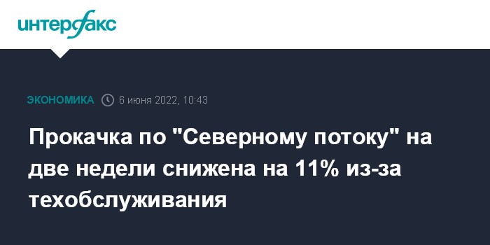 Москва. 6 июня. INTERFAX.RU - Возможности прокачки по морскому газопроводу "Северный поток" – главному маршруту доставки российского газа в Европу – на две недели снижены на 11% из-за технического обслуживания. Об этом говорится в сообщении оператора магистрали Nord Stream AG.