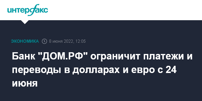 Москва. 8 июня. INTERFAX.RU - Банк "ДОМ.РФ", дочерний банк одноименной госкорпорации, с 24 июня ограничивает платежи и переводы в долларах и евро.