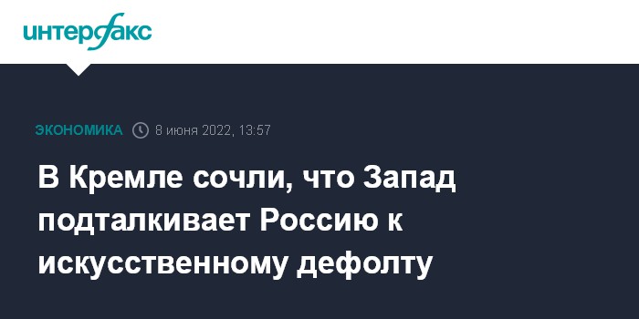 Москва. 8 июня. INTERFAX.RU - Запад подталкивает Россию к искусственному дефолту, заявил пресс-секретарь президента РФ Дмитрий Песков.