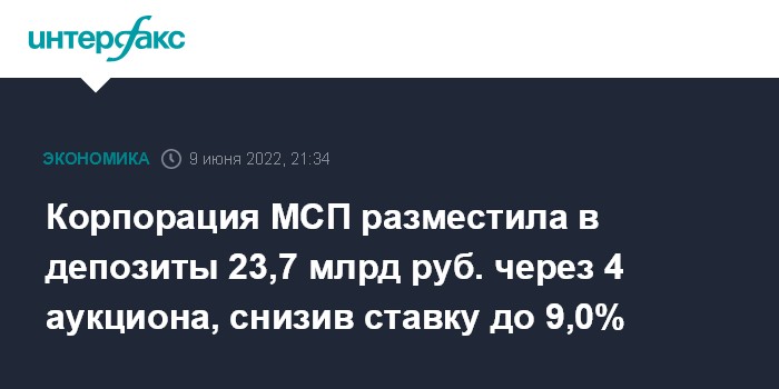 Корпорация МСП разместила в депозиты 23,7 млрд руб. через 4 аукциона, снизив ставку до 9,0%