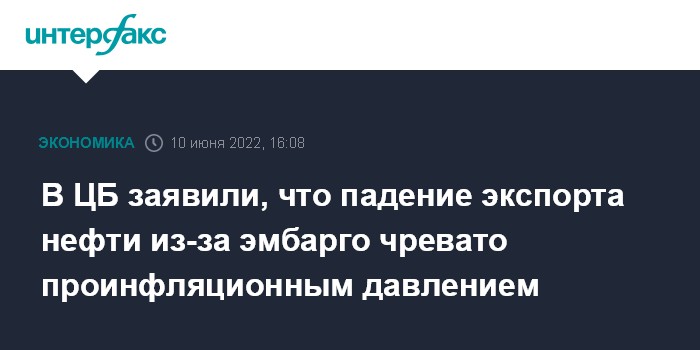 В ЦБ заявили, что падение экспорта нефти из-за эмбарго чревато проинфляционным давлением
