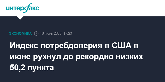 Москва. 10 июня. INTERFAX.RU - Индекс потребительского доверия в США в июне упал до 50,2 пункта по сравнению с 58,4 пунктами месяцем ранее, свидетельствуют предварительные данные Мичиганского университета, который рассчитывает этот показатель.