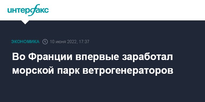 Москва. 10 июня. INTERFAX.RU - Первый во Франции морской парк ветрогенераторов, расположенный на западе страны близ Сен-Назера, начал выработку электроэнергии, пишет Le Figaro со ссылкой на консорциум, владеющий объектом, и оператора системы энергосетей Франции Rеseau de Transport d'Еlectricitе (RTE).
