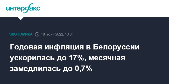 Москва. 10 июня. INTERFAX.RU - В мае годовая инфляция в Белоруссии (относительно аналогичного месяца 2021 года) ускорилась до 17% против 16,8% в апреле, 15,9% в марте и 10% в феврале, сообщил Национальный статистический комитет Белстат.