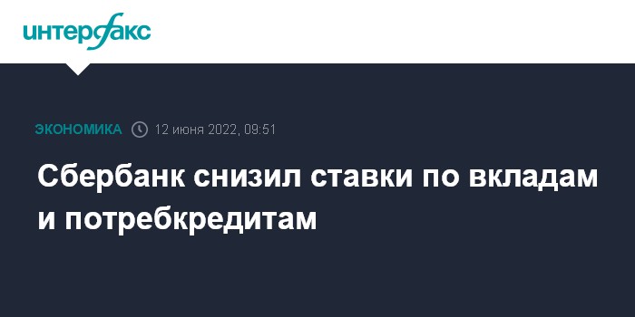 Москва. 12 июня. INTERFAX.RU - Сбербанк снизил ставки по основным вкладам физических лиц на 1,5 процентного пункта (п.п.), следует из материалов на сайте банка.