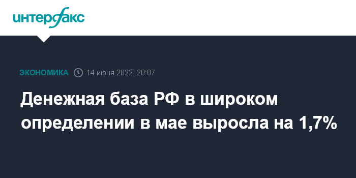 Москва. 14 июня. INTERFAX.RU - Денежная база РФ в широком определении в мае 2022 года увеличилась на 318,9 млрд рублей, или на 1,7%, до 18 трлн 663,7 млрд рублей. Такие данные содержатся на сайте Банка России.