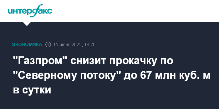 Москва. 15 июня. INTERFAX.RU - Прокачка газа по "Северному потоку" снизится до 67 млн куб. м в сутки из-за вынужденной остановки еще одного газотурбинного двигателя Siemens на КС "Портовая", сообщил "Газпром".