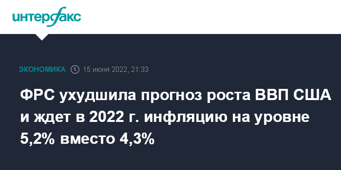 Москва. 15 июня. INTERFAX.RU - Федеральная резервная система (ФРС) понизила прогноз роста ВВП США в 2022-2024 годах и повысила прогноз подъема потребительских цен в стране в 2022 году.