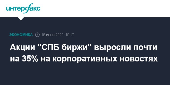 Москва. 16 июня. INTERFAX.RU - Акции "СПБ биржи" выросли в начале торгов на Московской бирже в четверг почти на 35% (до 257 рублей за штуку) на корпоративных новостях.