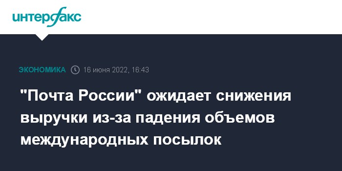Москва. 16 июня. INTERFAX.RU - Падение объемов трансграничных почтовых отправлений, составившее за 5 месяцев 58%, может повлечь снижение маржинальности АО "Почта России" в 2022 году, заявил "Интерфаксу" глава компании Максим Акимов.