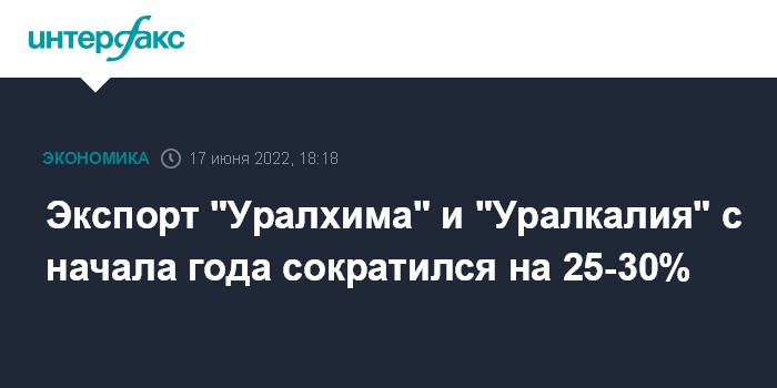 Москва. 17 июня. INTERFAX.RU - Объем экспорта "Уралхима" и "Уралкалия" с начала года сократился на 25-30%. Об этом рассказал "Интерфаксу" генеральный директор "Уралхима" Дмитрий Коняев в кулуарах ПМЭФ-2022.