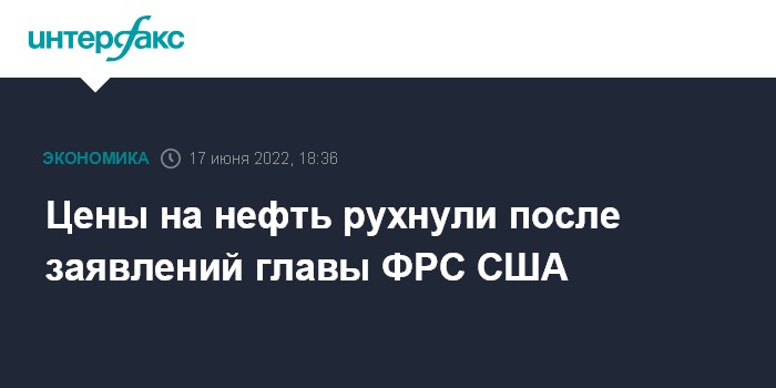 Москва. 17 июня. INTERFAX.RU - Цены на нефть начали резко падать после заявлений главы Федеральной резервной системы Джерома Пауэлла о твердом намерении добиться снижения инфляции в США.