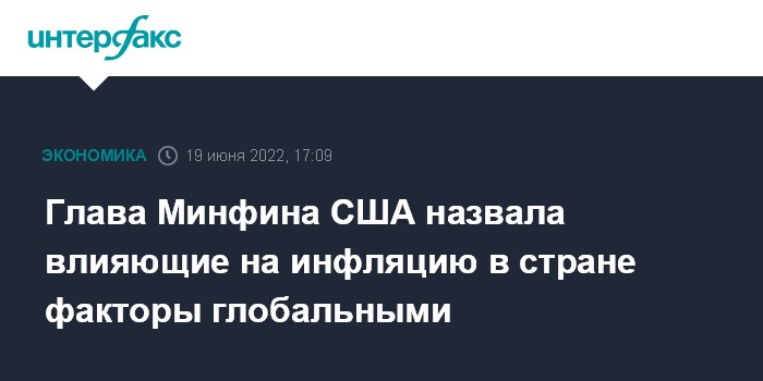 Москва. 19 июня. INTERFAX.RU - Уровень инфляции в США "неприемлемо высок", и, хотя рост цен, вероятно, замедлится в ближайшие месяцы, однако влияющие на это факторы не исчезнут в одночасье, заявила в воскресенье каналу ABC глава Минфина США Джаннет Йеллен.
