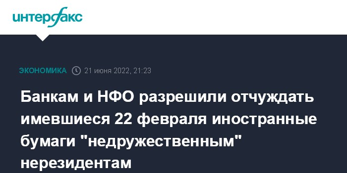 Москва. 21 июня. INTERFAX.RU - Российским банкам и некредитным финансовым организациям (НФО) разрешено проведение сделок с нерезидентами из недружественных государств, при проведении которых иностранные ценные бумаги, принадлежавшие по состоянию на 22 февраля 2022 года российским банкам, НФО, а также их клиентам-резидентам, отчуждаются в собственность таких нерезидентов.