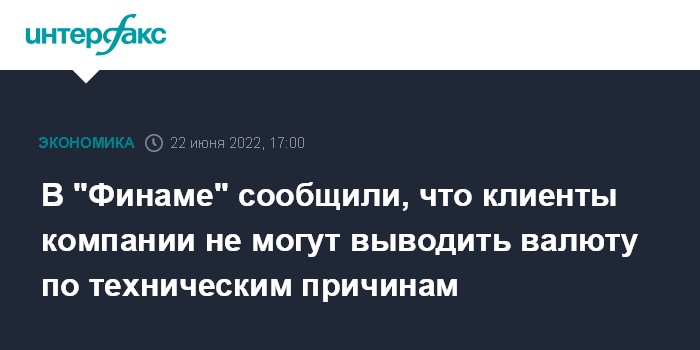 Москва. 22 июня. INTERFAX.RU - Клиенты "Финама" не могут выводить валюту по техническим причинам, пояснил "Интерфаксу" заместитель гендиректора по брокерскому бизнесу компании Дмитрий Пантеровский.