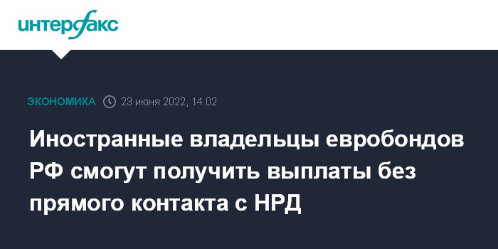 Москва. 23 июня. INTERFAX.RU - Новая схема обслуживания суверенных евробондов РФ в рублях предусматривает возможность для держателей избежать в процессе осуществления выплат прямого контакта с "Национальным расчетным депозитарием" (НРД), который с начала июня находится под блокирующими санкциями Евросоюза.