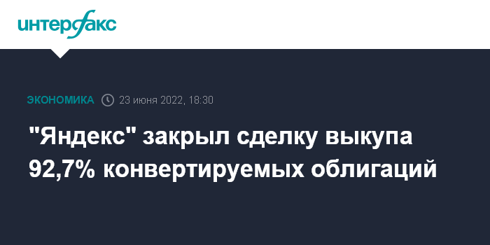 Москва. 23 июня. INTERFAX.RU - "Яндекс" закрыл сделку выкупа конвертируемых облигаций у держателей 92,7% ценных бумаг, говорится в сообщении компании.