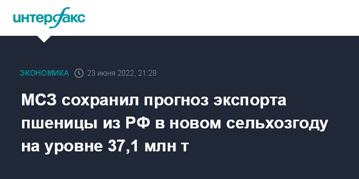Москва. 23 июня. INTERFAX.RU - Международный совет по зерну (МСЗ) в июньском отчете сохранил все прогнозы по зерновому рынку РФ в новом сельхозгоду (июль 2022-июнь 2023 гг.) на уровне мая.