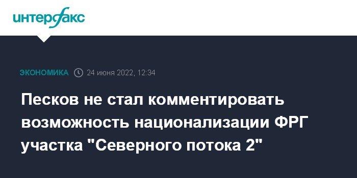Москва. 24 июня. INTERFAX.RU - Нельзя комментировать возможность национализации немецкого участка газопровода "Северный потока- 2", потому что пока нет каких-то конкретных действий на этот счет со стороны властей ФРГ, заявил пресс-секретарь президента РФ Дмитрий Песков.